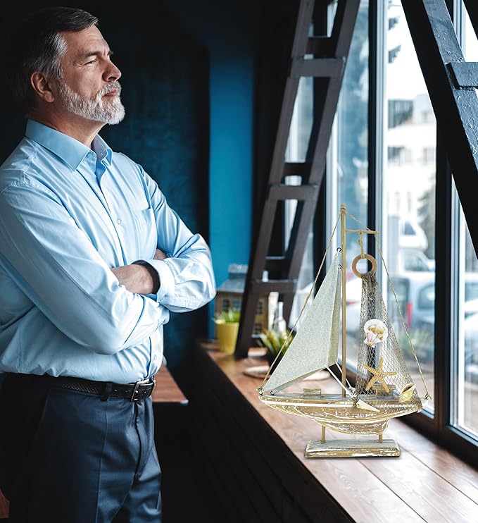 - Includes 1 Ocean Themed Decor Wooden Boat Model - You'll receive one fully assembled ocean decor for home wooden sailboat with a built-in wooden stand, making it easy to place on any shelf, desk, or tabletop. This rustic model sailboat is designed with cool sailboat accessories like the shade sail and a fishing net adorned with seashell ornaments. Anyone who loves collecting wooden coastal decor for home will love this Baja wooden boat.