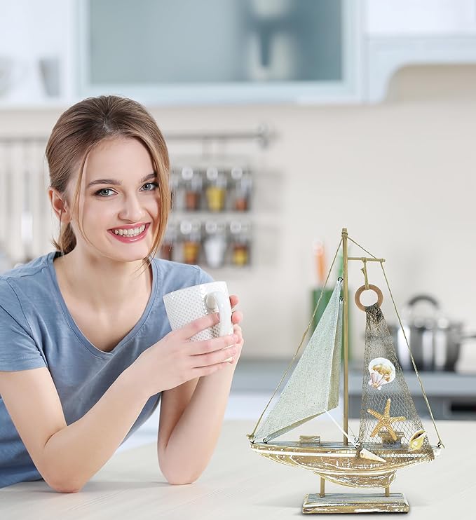 - Feature a Coastal Centerpiece Wooden Sailboat Decor - This wooden sailboat piece of beachy home decor features a coastal design, complete with realistic sailboat details, a net sail decorated with seashell ornaments, and a sturdy hull in a whitewashed finish. The rope, fabric, and wooden textures make it an eye-catching nautical centerpieces for tables or shelves. The beach-inspired nautical table decor brings an ocean breeze feel into your home.