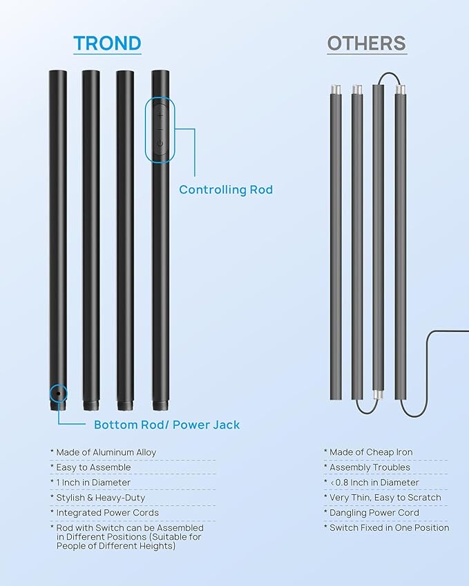 - Modern Tall Floor Lamp: This floor lamp innovatively features 4 modular aluminum rods, all of which have the integrated power cords built inside. This design gives you the convenience and flexibility to assemble, disassemble and adjust the height. Its total height is 180 cm/71 in, taller than other similar lamps, so that you won’t stare directly at the bright light