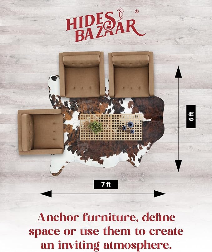 Tricolor Cowhide Rug Classic Brown, Black and White Color Mix, Natural Leather Hide, Area Rug (6x7ft)
