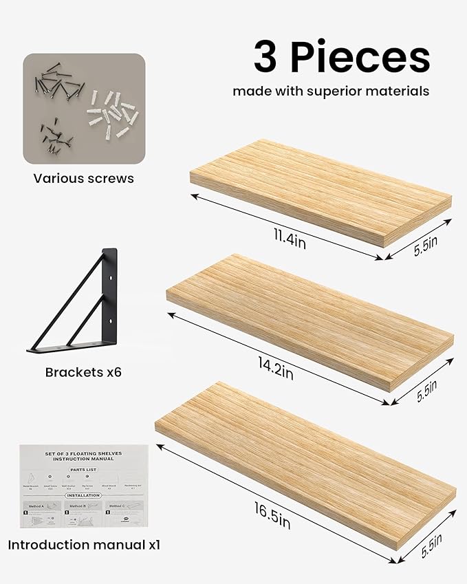- 【Sturdier and Easy to Install】Large: 16.5 × 5.5 × 4.6 inches; Medium: 14.2 × 5.5 × 4.6 inches; Small: 11.4 × 5.5 × 4.6 inches. These floating shelves are wider and sturdier than others to safely hold collectibles, photos, small plants and showcase favorite dishes or build your own coffee bar. Easy to assemble with all necessary hardware included according to the instruction steps.