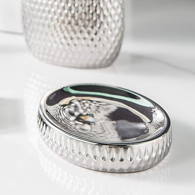 - This Bathroom Accessory Set is uniquely designed with raindrop shape, silver plating to create deluxe bathroom decoration, the silver bathroom accessory set and decor includes a lotion/soap pump dispenser, a toothbrush holder, a tumbler and a dish.