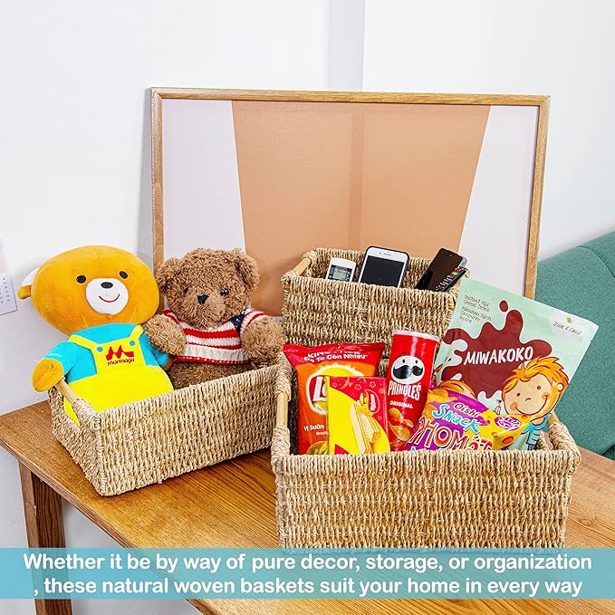 - ✅ Natural & High Quality - Our wicker baskets for shelves are made of Seagrass, a natural material with an iron frame for sturdy and durable storage. The nice wooden handles on both sides are to help you easily carry the wicker baskets.