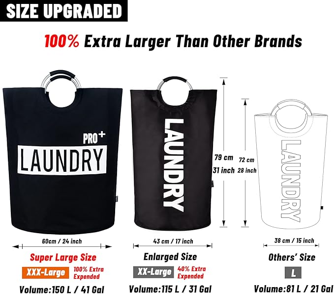 Caroeas Super Large 150L Laundry Basket Pro, Waterproof Laundry Hamper, Collapsible Laundry Basket Easy Storage, Clothes Hamper Stands Up Well, Laundry Bag with Padded Handles (Black)
