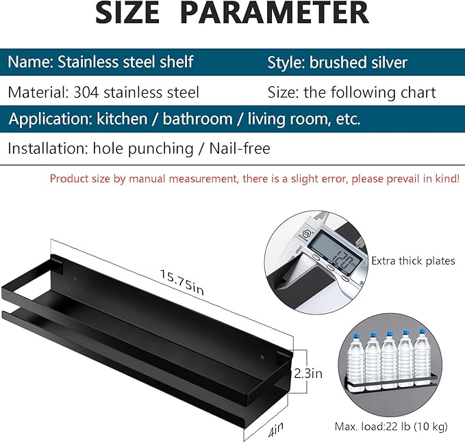 - Material:Made of high quality anodized stainless steel with polished and brushed finish, this shelf is strong and durable, resistant to rust, dust, scratches, corrosion and damage, and suitable for wet environments.