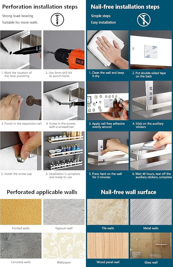 - 2 Ways to Install:The floating shelf comes with mounting hardware(Glue/Screws/Wall anchors), you can install it once you received the package.Drill Free:Glue + Auxiliary stickers, mainly used for flat and smooth surfaces, not suitable for uneven surfaces and wallpaper.Just 48 hours of waiting before use. Traditional Drilling: with mounting hardware.Home renovation can be easily completed in just a few minutes,decorative caps help to hide screws, making it look more stylish and elegant.