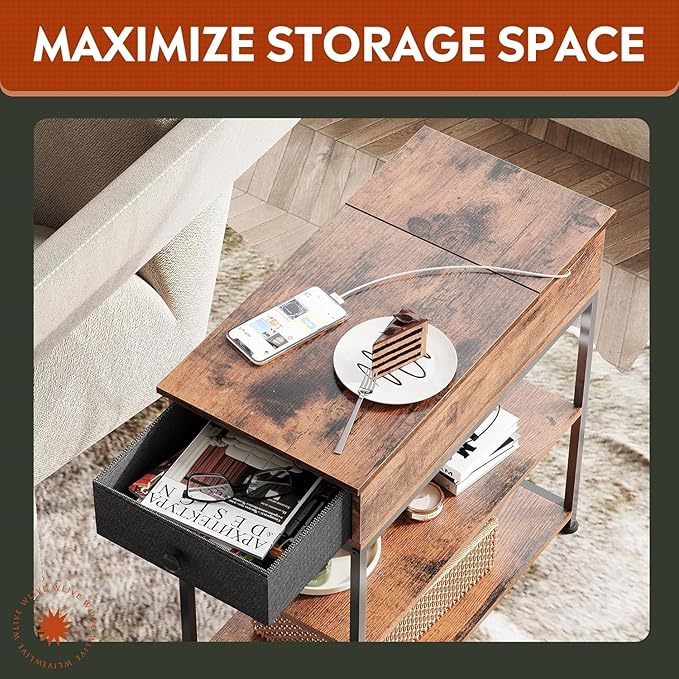 WLIVE Narrow Side Table with Charging Station, End Table for Living Room, Couch Side Table with Fabric Drawer for Bedroon, 11.8‘’W 23.6‘’L 24‘’H, Rustic Brown
