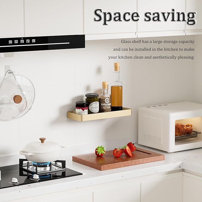 - Easy To Install: All the accessories needed for bathroom storage shelf installation are included, easy and fast to install; The glass floating shelves for wall is suitable for all kinds of bathrooms, showers, vanities, kitchens, dining rooms, wine coolers, bedrooms, bathrooms, hallways and so on.