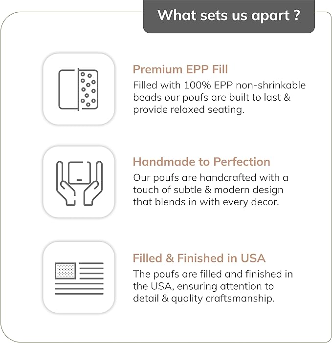 - Eco-Friendly & Durable Fill: Pre-filled with recyclable and resilient Expanded Polypropylene (EPP) beads, this pouf ottoman foot rest offers support and comfort while promoting sustainable living practices. Its eco-conscious construction makes it a smart, premium materials choice for the modern home.