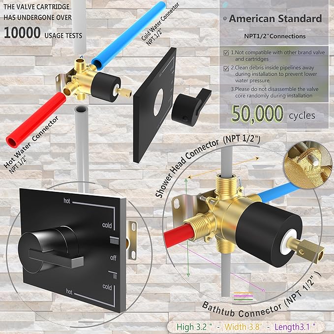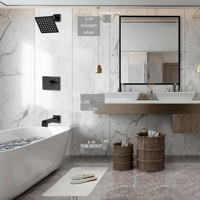 - 🎁【COMPLETE KIT】 : Including 6 inch square rain shower head(304 stainless steel), 6 inches shower arm(304 stainless steel),shower mixer control valve(Brass),tub spout(304 stainless steel)shower arm,tub spout and shower mixer valve are 1/2" NPT threaded. Standard U.S. connection size, ensuring easy and fast installation.