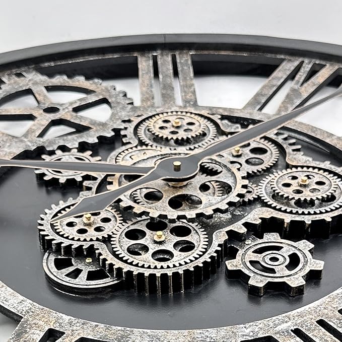 - 【Real Moving Gear Clock】All gears for the wall clock are real moving! Design with rustic bronze-color and industrial style. An creative combination of four gears for a retro look, has a very exquisite decorative effect makes the wall clock become a chic art works. The large wall clock crafted of nature wood & MDF. Big roman numeral numbers and wood rustic moving gears perfect for any room decor.