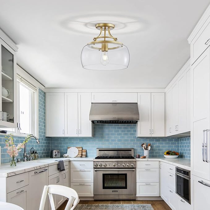 WUZUPS Chandelier Rustic Farmhouse Industrial Round Semi-flushmount Ceiling LED Light Fixture with Clear Glass Shades for Bathroom Kitchen Foyer Entryway, H 11.8" x W 13.4", E26 Base, Gold