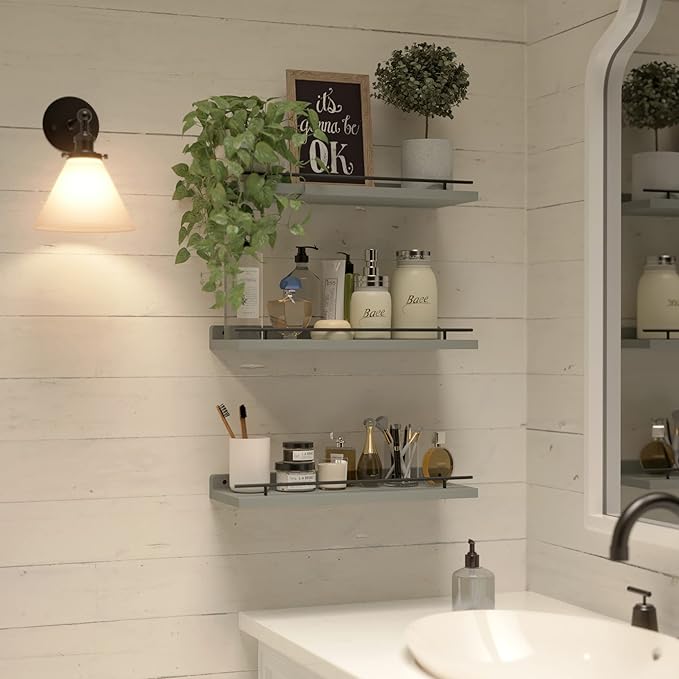 WOPITUES Floating Shelves with Black Metal Guardrail, Shelves for Wall Decor Set of 3, Wall Shelves for Bedroom, Bathroom, Kitchen, Living Room, Plants, Picture Frames, Art- Grey