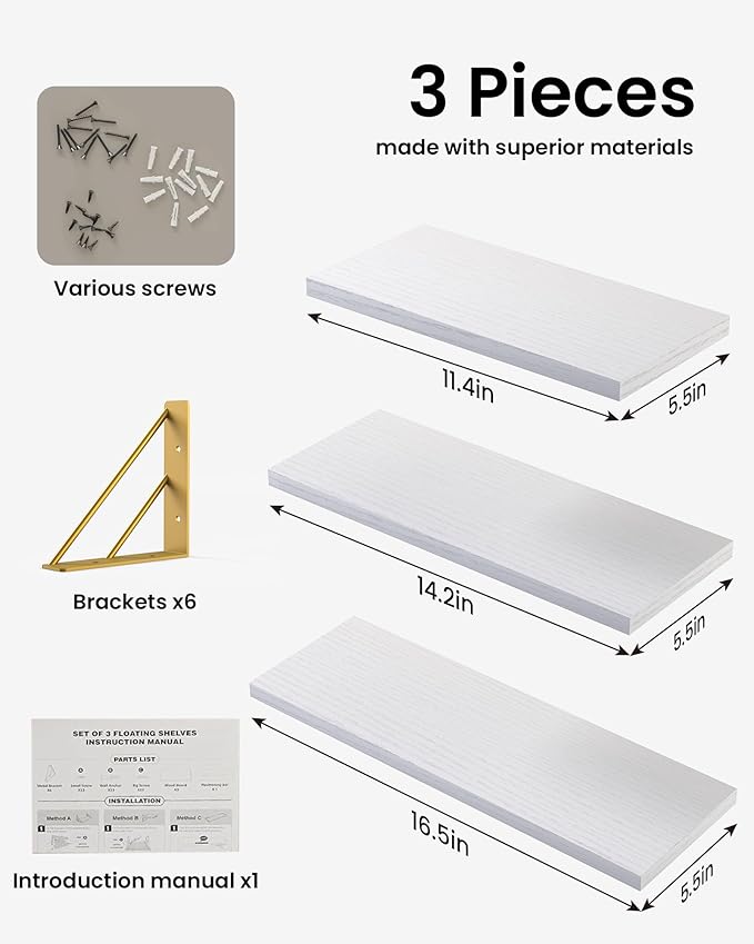 - 【Sturdier and Easy to Install: Large】16.5 × 5.5 × 4.6 inches; Medium: 14.2 × 5.5 × 4.6 inches; Small: 11.4 × 5.5 × 4.6 inches. These floating shelves are wider and sturdier than others to safely hold collectibles, photos, small plants and showcase favorite dishes or build your own coffee bar. Easy to assemble with all necessary hardware included according to the instruction steps.