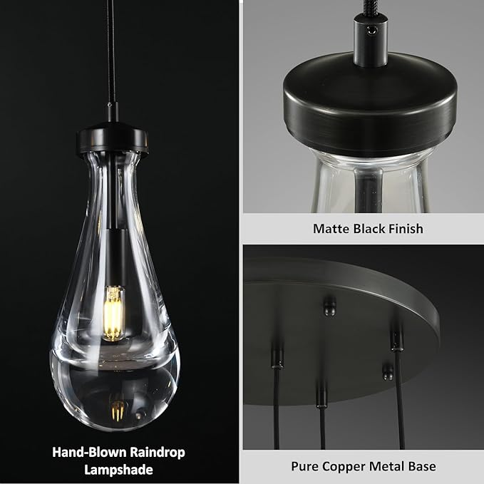 - 【DIY Your Preferred Height】Morden 5-light black raindrop pendant lighting features an adjustable hanging rope. You can freely adjust the hanging rope length according to the height of the ceiling in your home to achieve the effect you want. The total length of the hanging rope is 100". the total weight of the raindrop cluster pendant lights kitchen island is 35 lb, and each raindrop shade can weigh up to 7 lb.