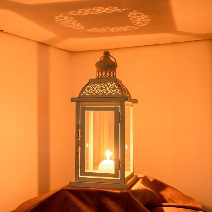 - EXOTIC CANDLE LANTERN DECOR- DECORKEY large vintage candle lanterns create an aura of old world charm. Adds a gorgeous touch and romantic ambiance to any space with the white hexagonal metal and glass lantern having intricate cutouts that allow the light to flood through and create unique patterns. Create a charming focal point on your table or mantel with this classy lantern to celebrate the upcoming festivals!