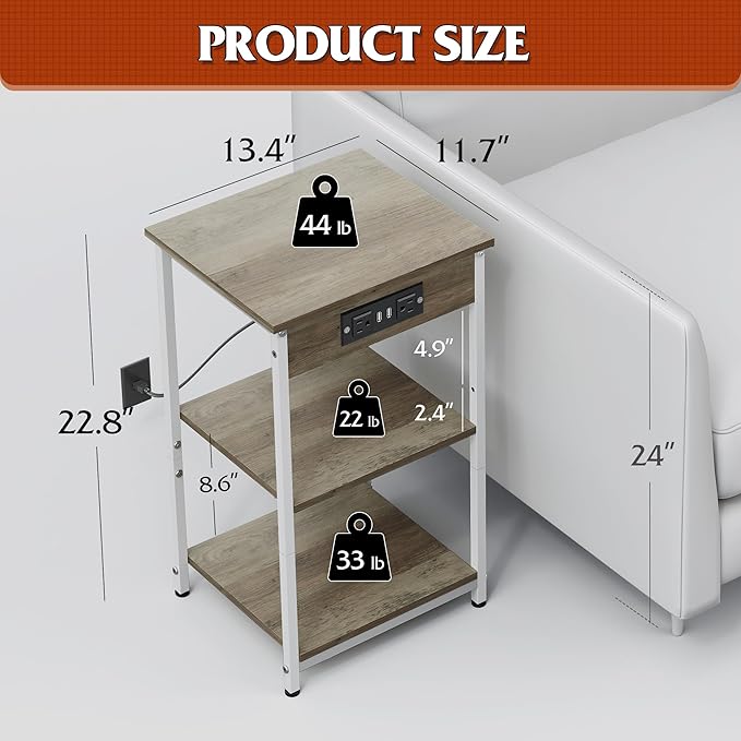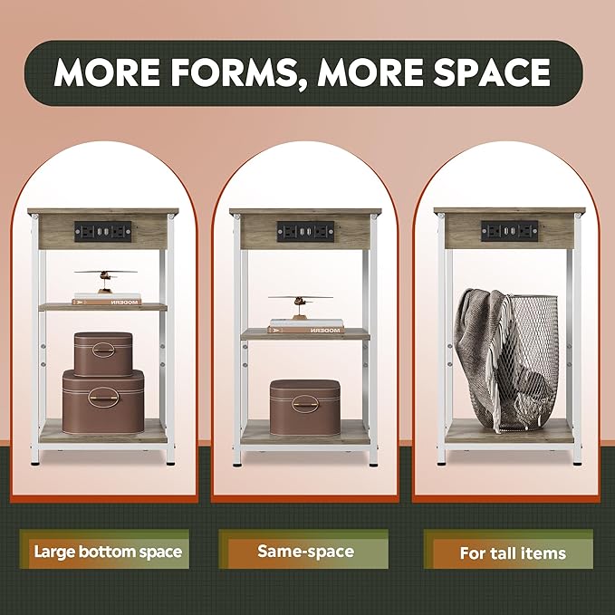 WLIVE Side Table with Charging Station and USB Ports, Small End Tables for Small Spaces, 3-Tier Nightstand with Adjustable Shelf, Bedside Tables, Living Room, Bedroom, Greige