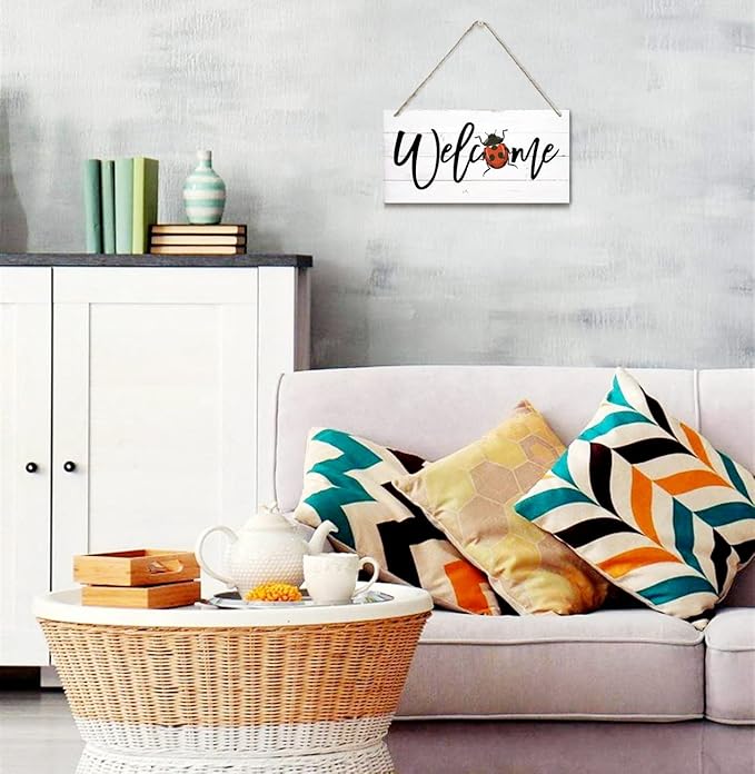 Welcome Decor Sign, Hanging Wood Sign Home Decorative, Printed Wood Wall Art Sign, Ladybug Welcome Sign, Door Sign, Front Door Wall Art Decor, Welcome Sign for Home Farmhouse Yard Garden 12 * 6inch