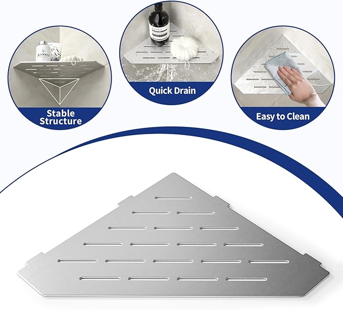 - 【Heavy Duty】Made of SUS304 stainless steel, this 3 mm thickness solid corner shower shelf can hold 20 pounds. Shelf surface is well brushed(Original color of stainless steel), which can help protect against corrosion, scratches and rust for years of use.