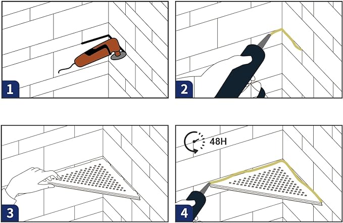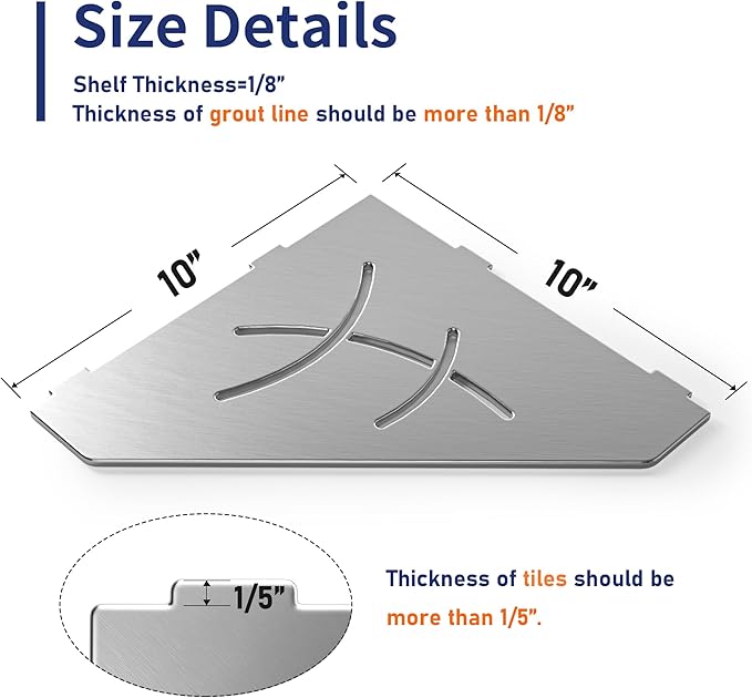 - 【Easy to Install】Easy installation in grout line between tiles. ONLY for 90°corner tiled wall. NO DRILLING required, no damage to wall. The thickness of grout line should be more than 1/8''. Its wall recessed part is about 1/5'' length, which means your tile need to be thicker than 1/5''.