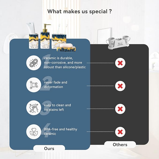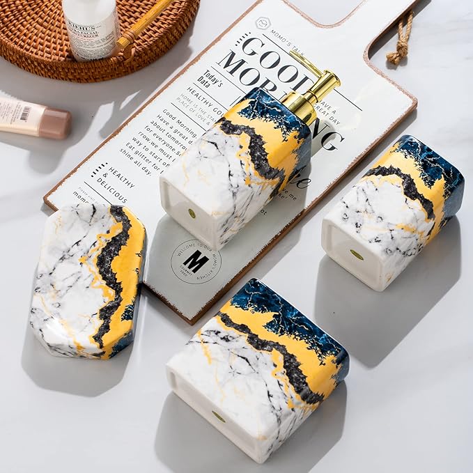 - 【Creative Design】Pretty Blue Marble ceramic bathroom accessories set, with a unique ceramics texture, will enrich your home decoration and impress your guests.