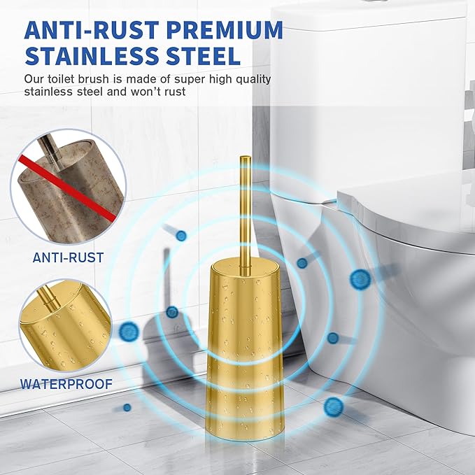 Toilet Brush and Holder, 2 Pack Toilet Brush Stainless Steel, Toilet Bowl Brush for Bathroom Toilet-Ergonomic, Elegant,Durable (Gold)