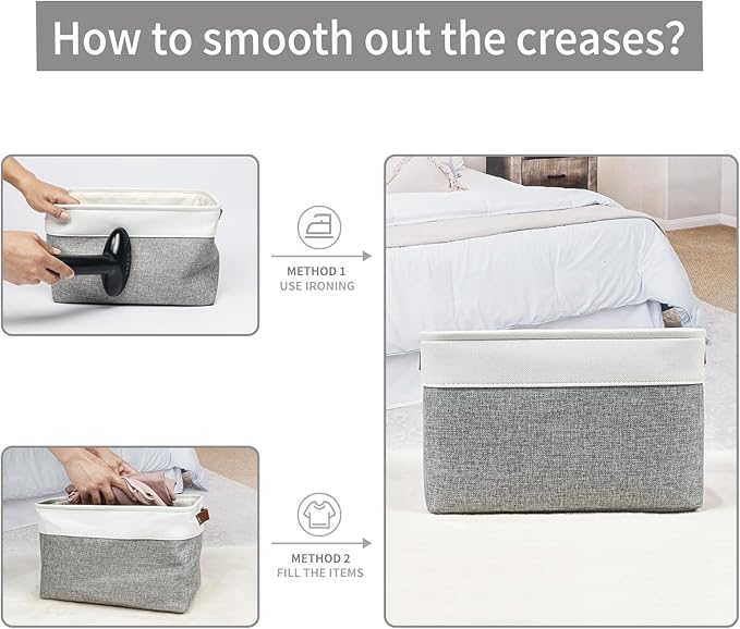 - 【Maintenance & Care Tip】 - Collapsible design for space saving. Our foldable baskets comes in a compression packing which may result in wrinkled storage bin during the long transit. Get rid of the wrinkles by either stuffing the fabric storage bins with blankets and pillows for a few days or steam iron them at low-heat setting. The organization baskets are easy to clean, you can dust the basket with a soft cloth with light soapy water when needed. Not recommended to machine wash.