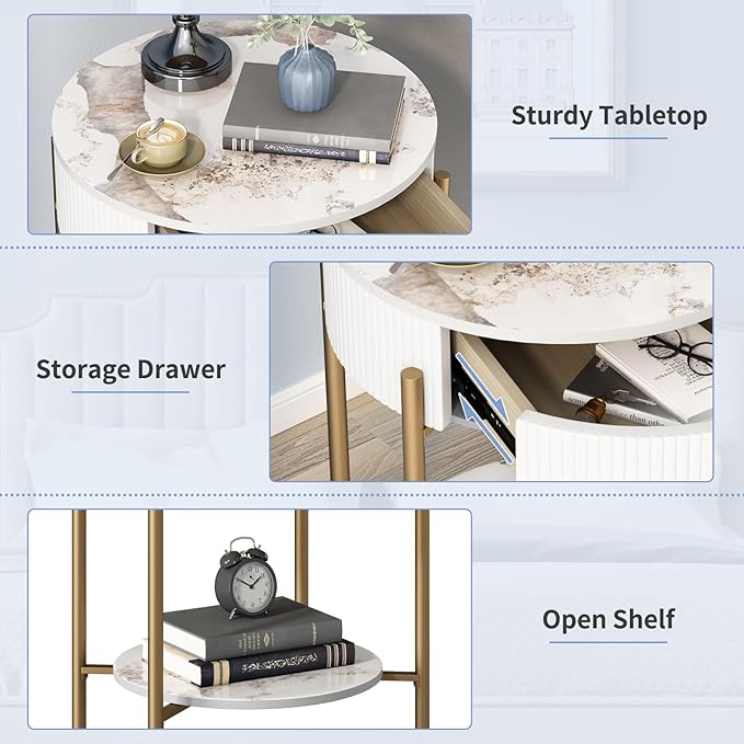 OIOG Modern End Table with Storage Drawer, Round 2-Tier Nightstand with Shelf, Gold Side Table with Metal Legs for Living Room, Bedroom, Office, Marbling Natural Stone/Gold