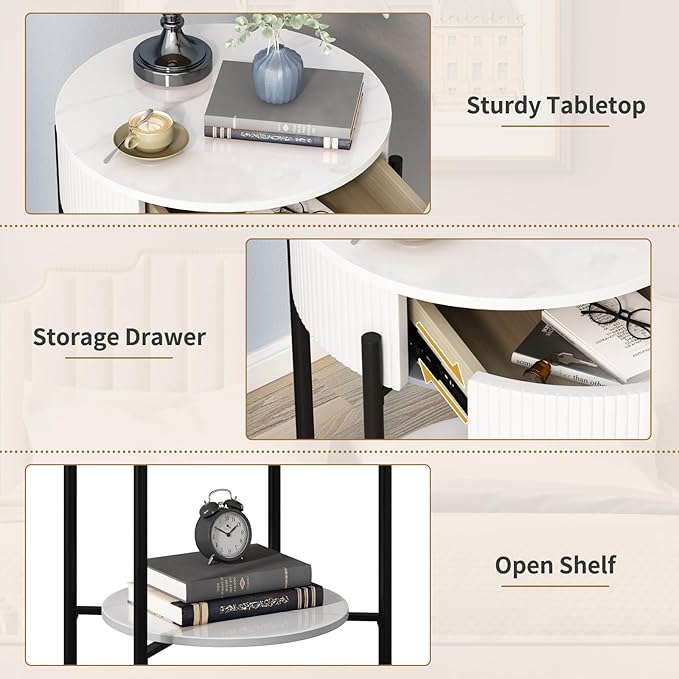 OIOG Round End Table with Drawer, Modern 2 Tier NightStand with Shelf, Small Side Table with Sintered Stone Tabletop for Living Room, Bedroom, Dorm, and Office, Marbling Natural Stone/White