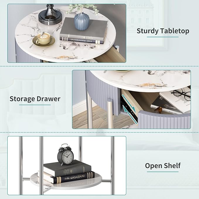 OIOG Round Side Table with Drawer, Modern Nightstand with Shelf and Chrome Finish Metal Legs, 2 Tier End Table for Living Room, Bedroom, Office, Marbling Natural Stone/Silver