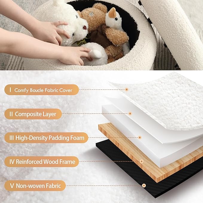 - [Enough Storage Space] A compelling layer of texture is added by the chic, soft boucle fabric, while the ribbed circular form creates a distinctive, modern design. Lifting the detachable lid reveals a storage area where you may arrange and organize all of your favorite things, including books, kid's toys, random objects, and more. You will have a tidy living area with room for all your pillows and blankets to be neatly stored inside.