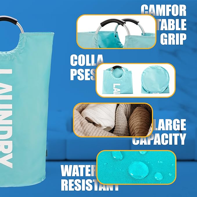 - 【Easy Storage More Comfort】Foldable laundry basket can be folded flatly in small portable size when not in using. Aluminum frame could hold heavy load and padded handles of large laundry hamper would keep hands comfortable.