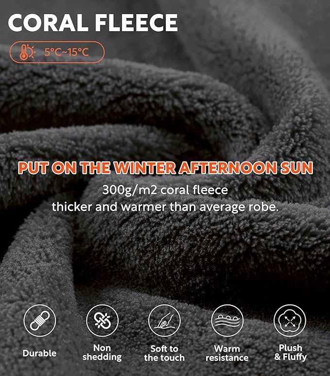 • THICKER & WARMER: Crafted with premium 300g/㎡ coral fleece fabric, The mens plush fleece robe is thicker and warmer than average robe offering a comfortable and toasty warp for you during the cold winter months.