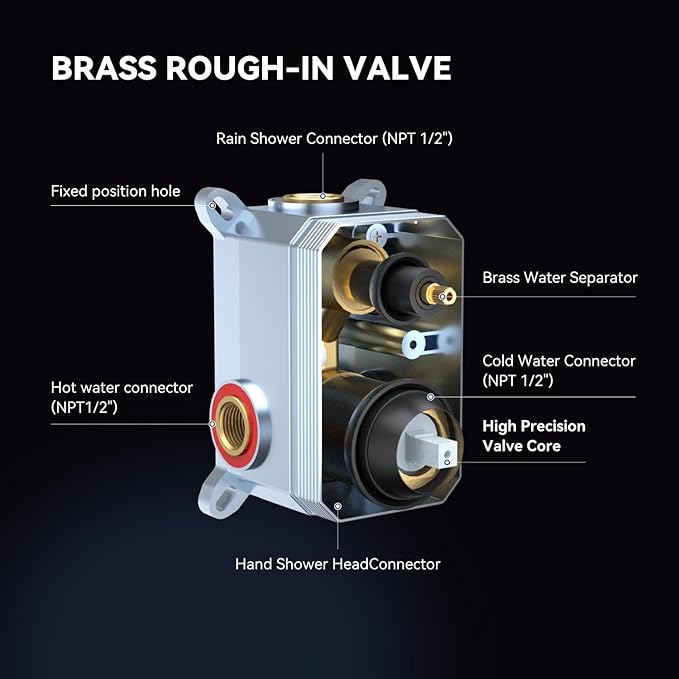 - 【Protection from Sudden Temperature Changes】 The Monitor Pressure Balanced Valve Cartridge (included) ensures a consistent shower temperature by balancing the pressure of both hot and cold water, so no sudden temperature changes from toilet flushing or running appliances. to avoid sudden temperature changes that affect your pleasure in bathing.