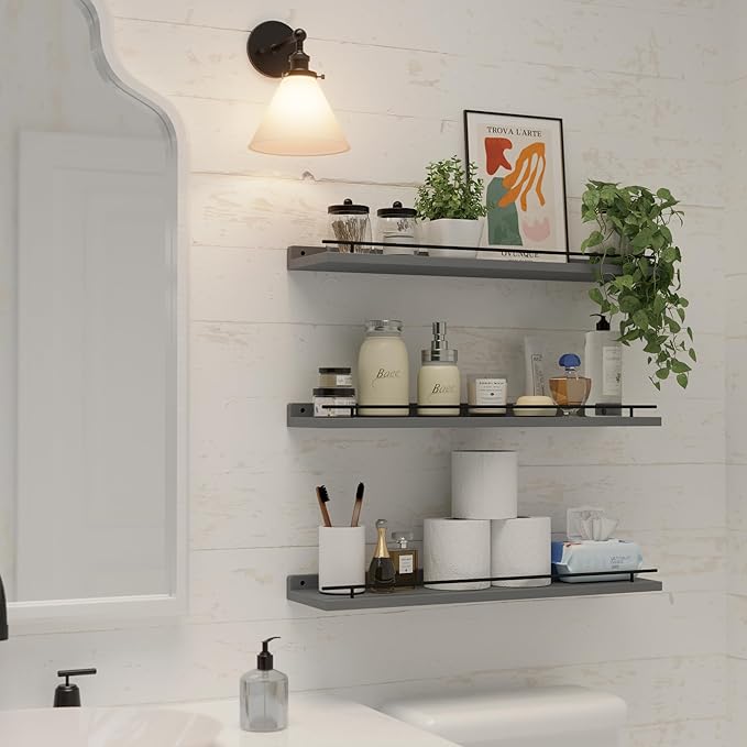 WOPITUES Floating Shelves 24 inch with Black Metal Guardrail, Shelves for Wall Decor Set of 3, Wall Shelves for Bedroom, Bathroom, Kitchen, Living Room, Plants, Picture Frames, Art- Grey