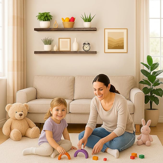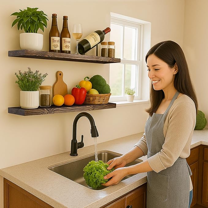 - Easy to Install: A set of two wide floating wooden shelves for wall includes stainless-steel hidden brackets, universal plugs, an instruction manual, and a video guide. Even beginners can easily handle the installation