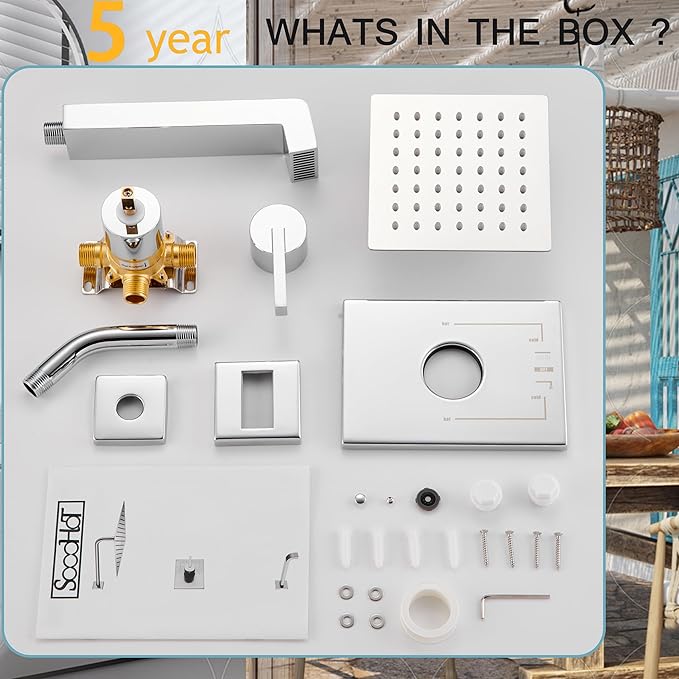 - 【tub and shower faucet combo】 : Including 6 inch square rain shower head(304 stainless steel), 6 inches shower arm(304 stainless steel),shower mixer control valve(Brass),tub spout(304 stainless steel)shower arm,tub spout and shower mixer valve are 1/2" NPT threaded. Standard U.S. connection size, ensuring easy and fast installation.