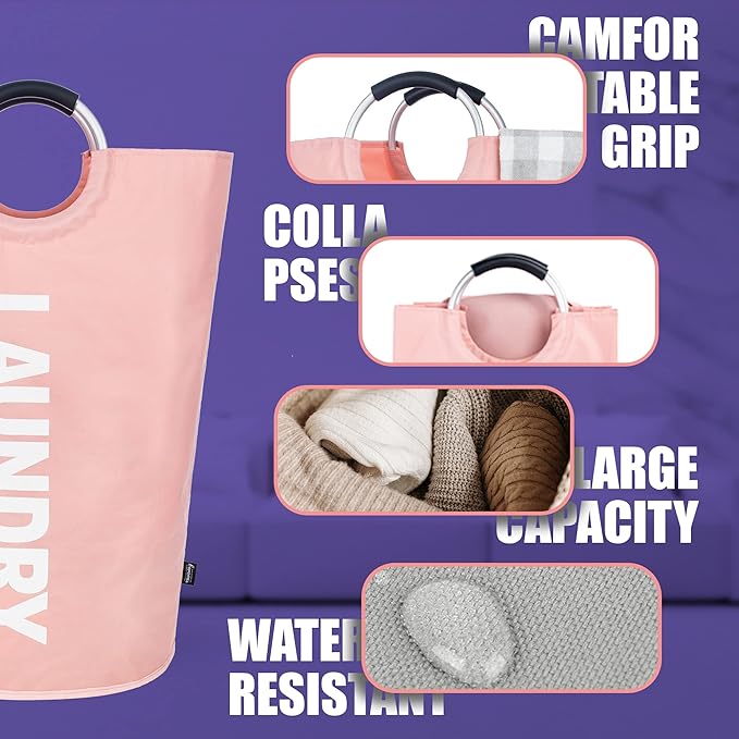 - 【Easy Storage More Comfort】Foldable laundry basket can be folded flatly in small portable size when not in using. Aluminum frame could hold heavy load and padded handles of large laundry hamper would keep hands comfortable.