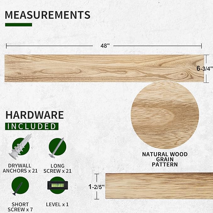 - Easy Installation: With the included hidden T-type mounting brackets and clear instructions, these floating shelves can be easily installed, providing a seamless, clutter-free look on your walls.