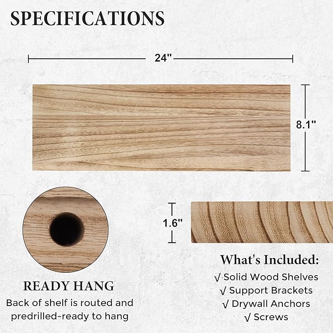 - Sturdy Support: Our high quality Solid Paulownia Wood construction ensures each shelf can hold up to 44 lbs, ensuring your items never sag or fall. Plus, the concealed mounting hardware gives the appearance of floating shelves.