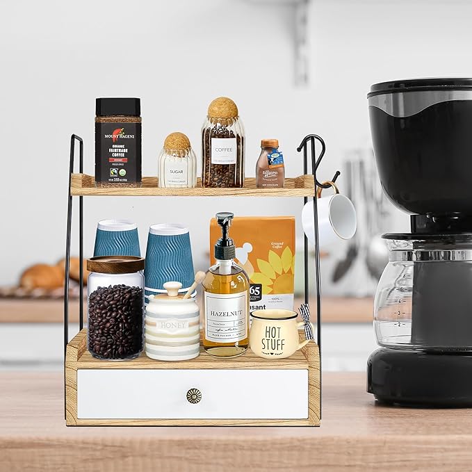 2 Tier Bathroom Counter Organizer with Drawer, Wood Bathroom Storage Shelf Counter for Cosmetic Vanity Tray Kitchen Spice Rack Coffee Station Organizer, Bathroom Decor