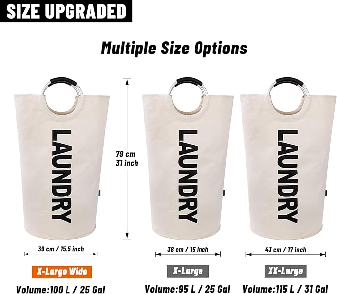 - [Upgraded Size and Capacity] This clothes basket has been scientifically reduced in size and capacity to improve its portability. The upgraded size is 15.4inx15.4inx31.5in (39cmx39cmx80cm) with the capacity of 100L.