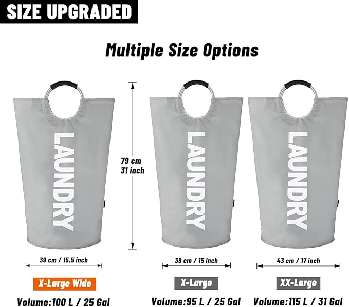 - [Upgraded Size and Capacity] This clothes basket has been scientifically reduced in size and capacity to improve its portability. The upgraded size is 15.4inx15.4inx31.5in (39cmx39cmx80cm) with the capacity of 100L.