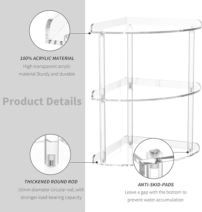 - 3 Tier Countertop Corner Shelf: The 3 tier counter corner organizer shelf is made in 100% high grade acrylic material. Crystal clear, 5mm thickness. Very sturdy and durable for your house. Sezanrpt offer 2 size for the corner shelf: 7x7x15.7 inch and 9.5x9.5x15.7 inch. Or 2 tier design. You can choose your favirote size for your counter. Non-toxic, safe design, moisture-proof and anti-slip. Perfect for your bathroom or kitchen.