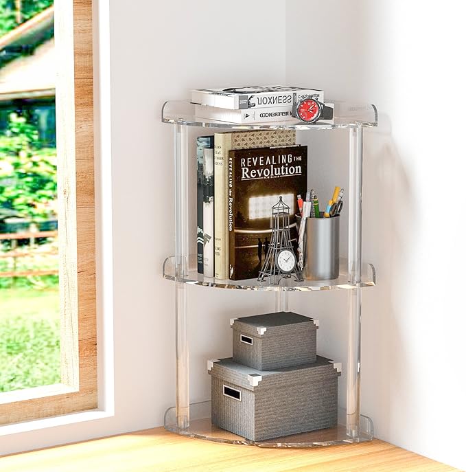 3 Tier Acrylic Corner Shelf Organizer Storage 9.5x9.5x15.7 Inch, Transparent Countertop Corner Shelf for Bathroom, Kitchen, Bedroom, Office, Study Room