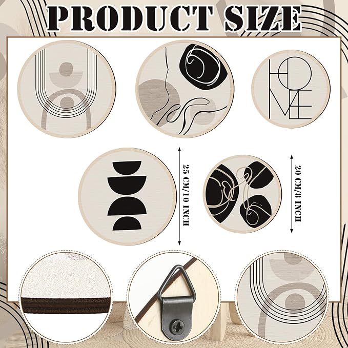 - Proper Size for Display: there are 2 kinds of sizes of the aesthetic wall art, 3 bigger ones measure about 10 inches/ 25 cm in diameter, and 2 smaller ones are about 8 inches/ 20 cm in diameter, all of them are about 0.2 inch/ 0.5 cm in thickness, proper size to catch people's attention
