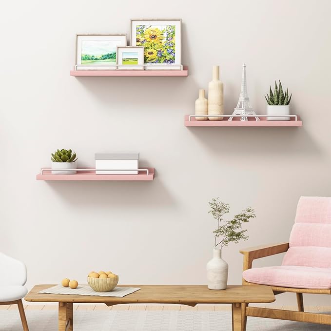 Pink and White Floating Shelves, Kawaii Room Decor Wall Shelves - Set of 3 for Living Room, Bedroom, Kitchen, Picture Frames, Plants
