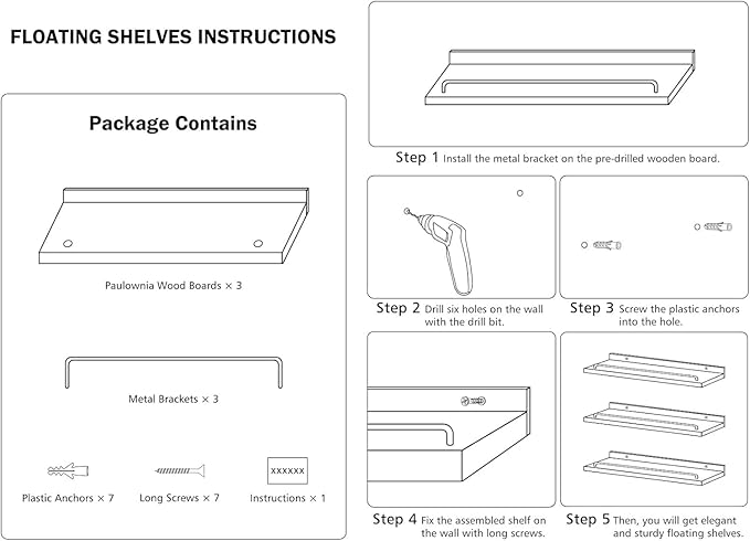 - [Easy Installation] The whole set of bathroom shelves includes 3 shelf boards, 3 metal guardrails, hardware, and step-by-step detailed instructions. You can organize your wall’s storage space. The mounting process simply takes a short time to complete with the help of instructions.