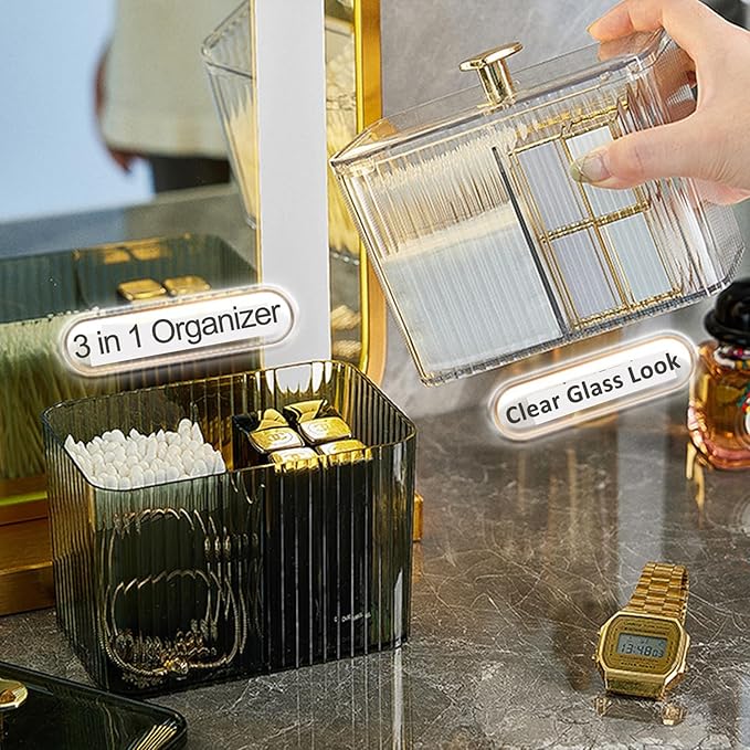 - 【Cotton swab box organizer】: 3 compartment vanity cotton swab storage organizer, keep a nice supply of cotton swabs and rounds and you’re able to access them quickly. How compact this is and not taking up a lot of space.