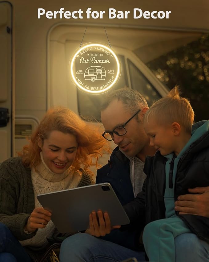 - 🍾【Perfect Wall Decor】Use this camper neon sign in your party to create a unique atmosphere and make a wonderful addition. It's a really nice mood light and it definitely adds flavor to an otherwise plain space. This led sign can also be used to decorate many scenes, such as garage, back yard, patio, poolside, bedroom, home pub, game room, man cave, BBQ party and so on.